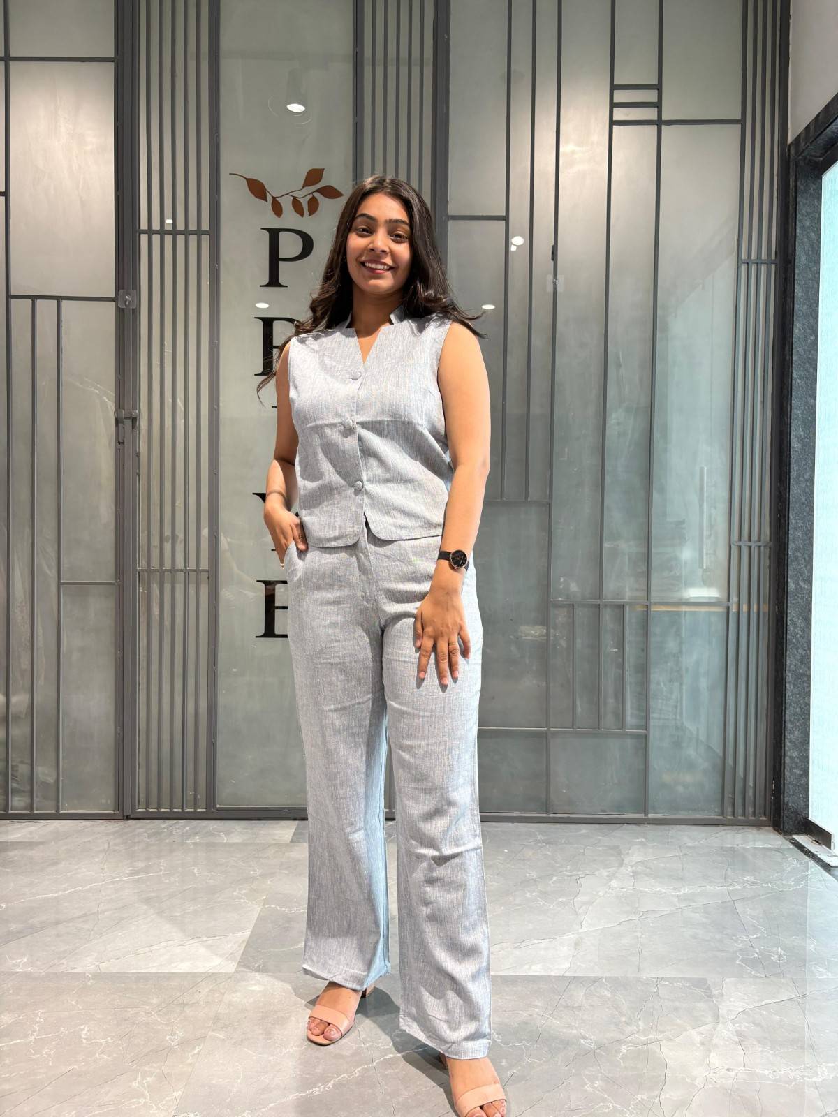 Crafted from high-quality 100% linen or a premium linen blend, the fabric is known for its natural texture, breathability, and lightweight feel. The vest is designed with sharp lines, clean buttons, and a flattering fit that adds a touch of androgynous elegance, while the matching bottoms complete the co-ord with effortless harmony. The slightly crisp texture of linen gives the outfit a fresh and structured silhouette, while still allowing comfort and movement.
