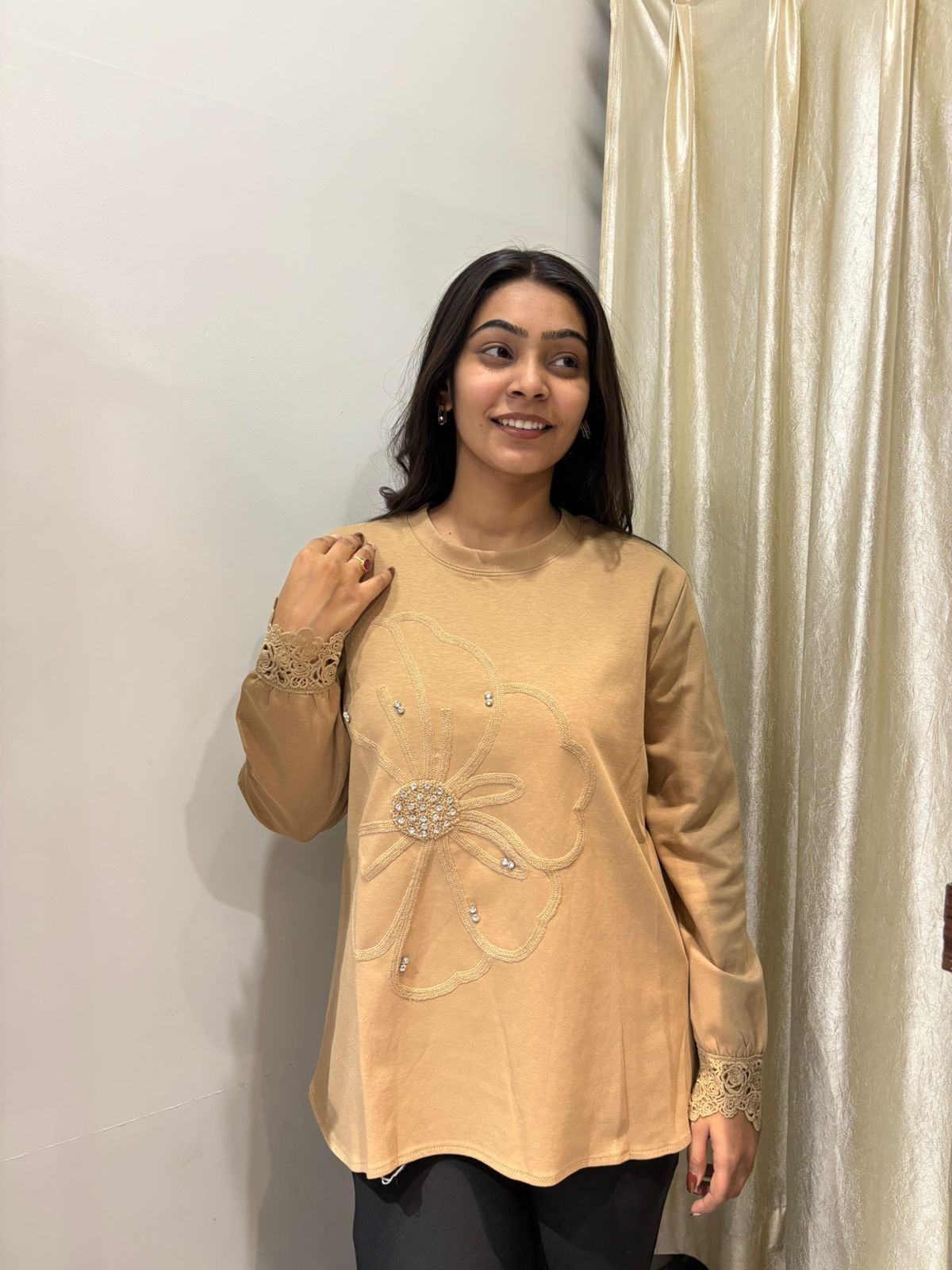 Stay effortlessly stylish with this solid embroidered sweat top, designed with delicate lace detailing on the sleeves for a soft, feminine touch. Comfortable, chic, and perfect for casual outings or light gatherings, it blends coziness with subtle elegance.