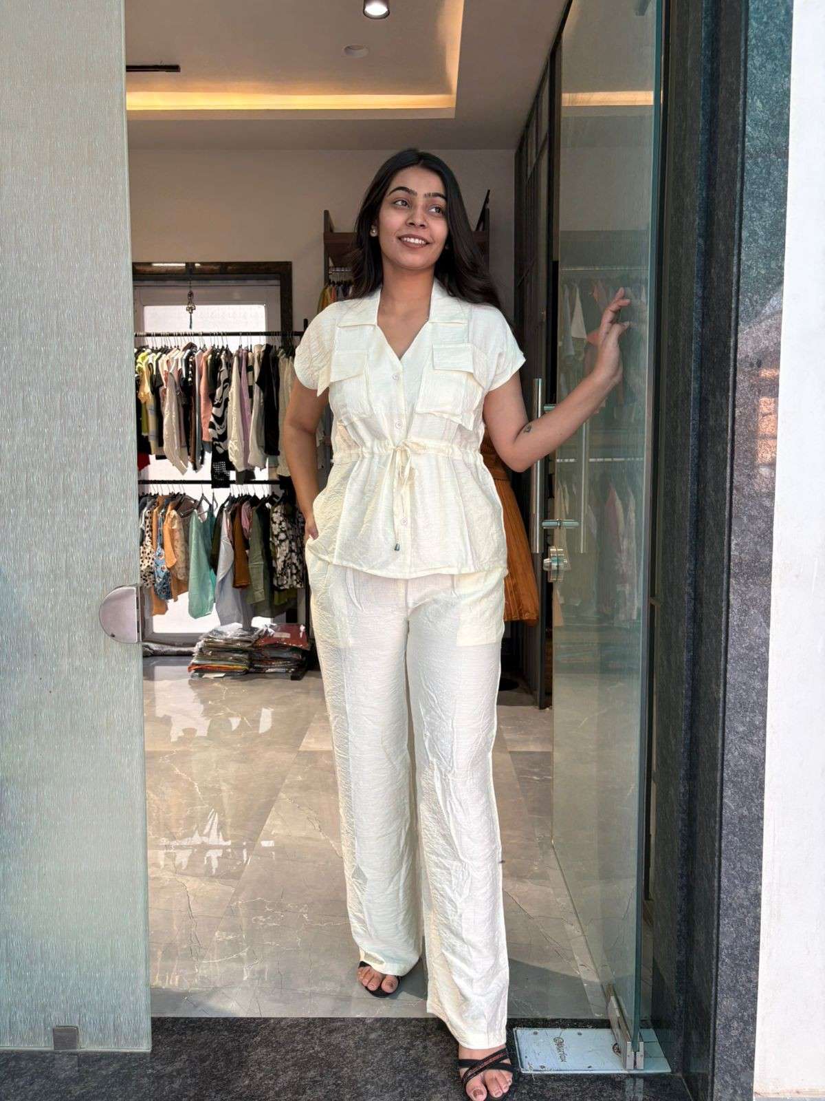 "A sleek solid adjustable coord set crafted from premium, breathable fabric. Designed for comfort and style, this set features an adjustable fit with fine stitching details, offering a perfect blend of elegance and ease for any occasion."